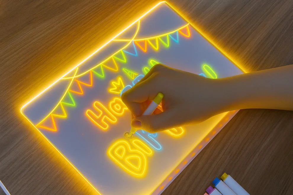 Offrez à vos enfants une nouvelle façon de dessiner et d’écrire grâce à cette tablette magique rétroéclairée. Avec ses couleurs néon vives et lumineuses, chaque dessin prend vie et transforme l’imagination en véritable spectacle visuel. Facile à utiliser avec ses feutres spéciaux effaçables, elle est parfaite pour apprendre, jouer ou décorer.